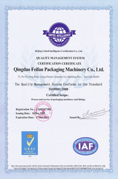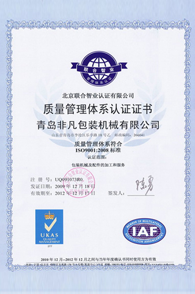 青岛非凡包装机械有限公司各部门在公司车德美总经理的领导下,经过5个多月的不懈努力,顺利通过了ISO9001质量管理体系认证评审,获得了《 ISO9001:2008国际质量体系认证证书》。这标志着青岛非凡包装机械有限公司在质量管理、人力资源、基础设施 、工作环境、技术操作、现场管理等一系列企业管理体系的成长和成熟。