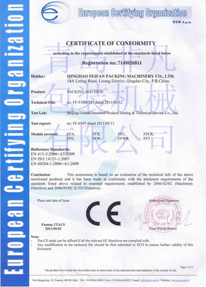 CE证书的获得标志着青岛非凡包装机械有限公司取得了顺利进入欧盟及欧盟自由贸易协会国家市场的通行证,为公司海外包装机市场的开拓奠定了基础;同时也标志我公司的包装机品质又上了一个新台阶。