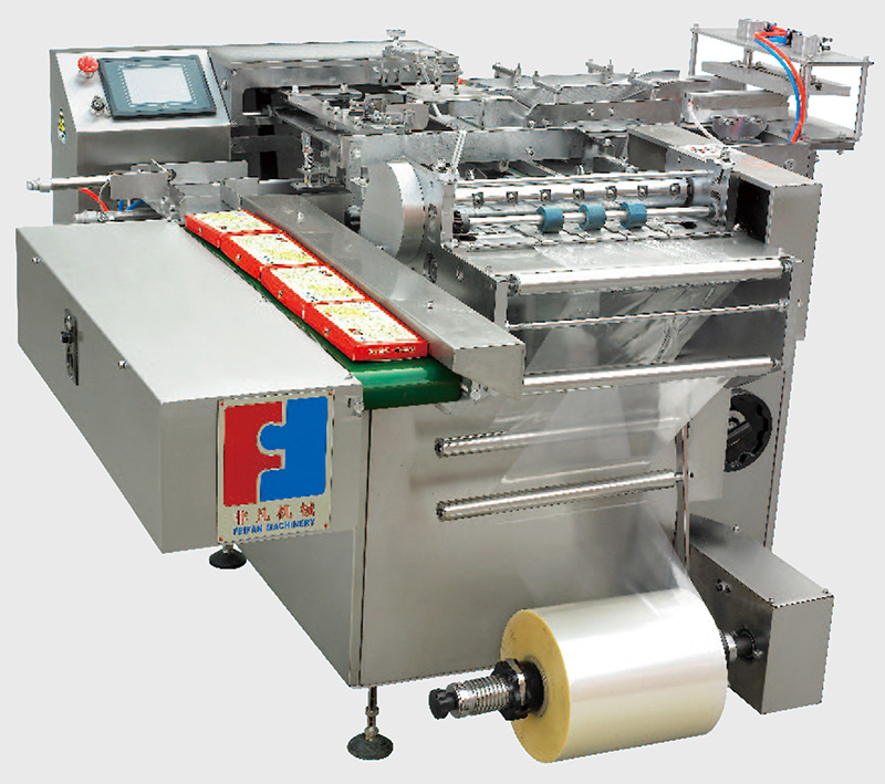 FFT-Z2型包装机包装膜前进方向与包装盒出料方向呈90度。该三维包装机的折叠裹包工艺路线为阶梯形。其包装工艺流程如下:a.包装盒进给,同时透明纸进给并定长切断;b.透明纸到位,同时包装盒上托形成倒“U”形裹包;c.折叠底面后长边;d.折叠两顶端后部的短边;e.折叠底面的前长边,热封底面长边,折叠两顶端前部的短边;f.折叠两顶端的下部长边和上部长边,并完成两顶端封合。
